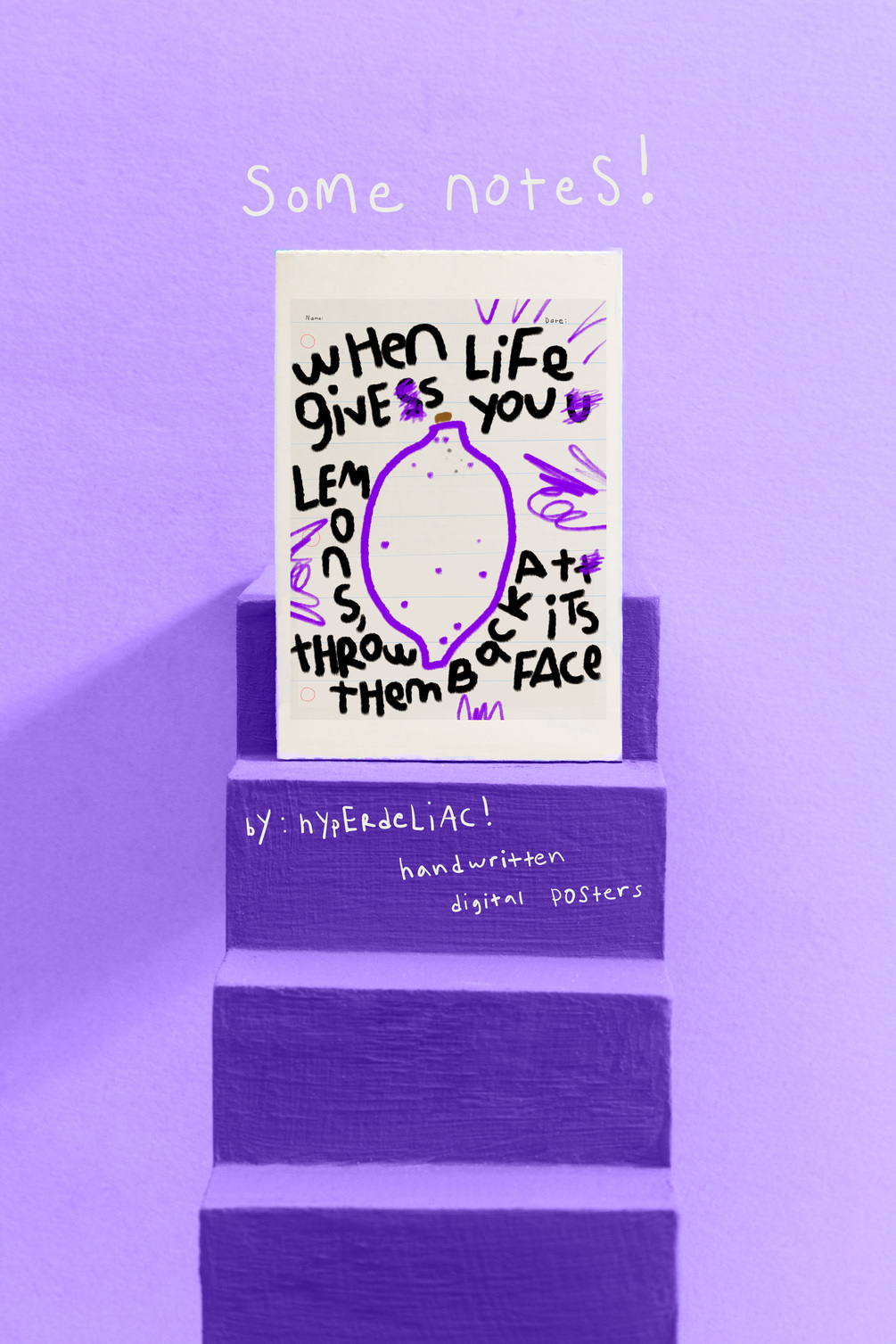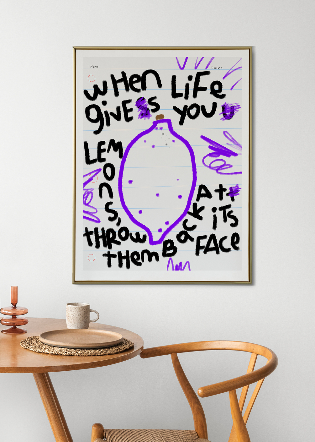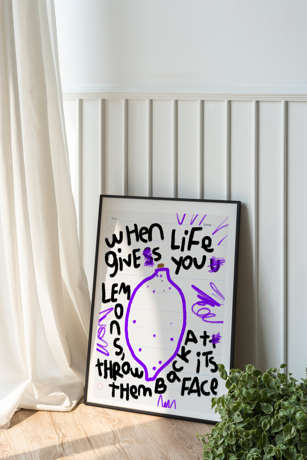 "When Life Gives You Lemons, Throw Them Back At Its Face" Quote Handwritten Printable Poster | Purple | Playfully Chaotic Crayon Note | SOME NOTES! by H!